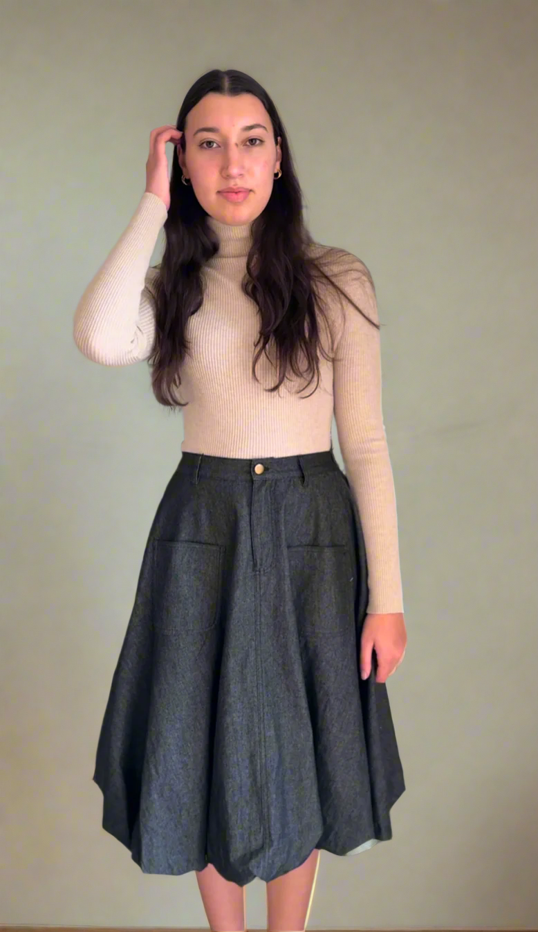 The Jean bubble skirt of your dreams features a comfort waist band and two pockets in the front.